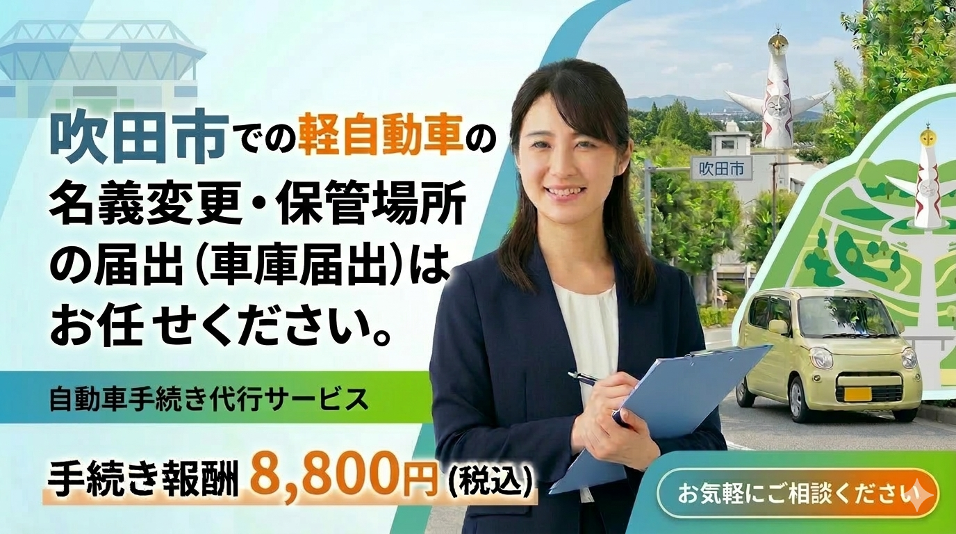 吹田市での軽自動車の名義変更・保管場所届出(車庫届出)はお任せください。
