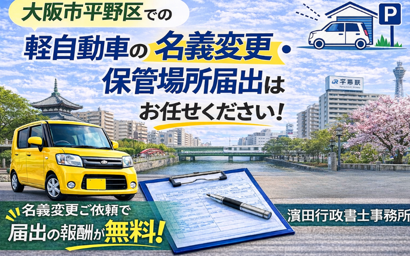 大阪市平野区の軽自動車名義変更・保管場所届出は濱田行政書士事務所へご相談ください。