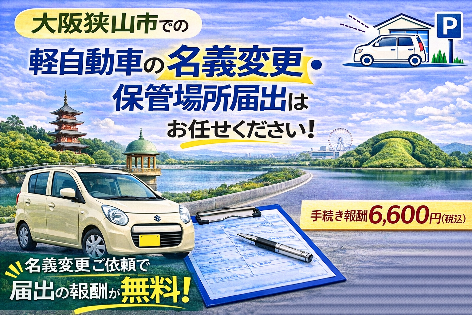 大阪狭山市での軽自動車の名義変更・保管場所届出(車庫届出)はお任せください。